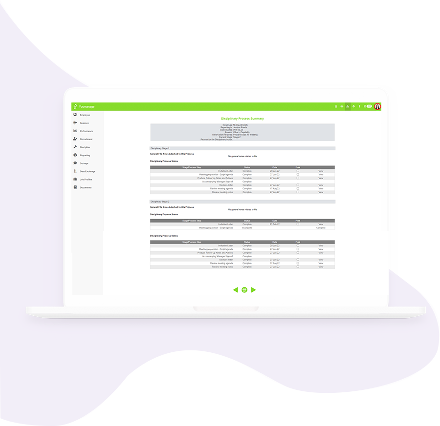 Youmanage provides employers and HR professionals with easy-to-follow, step-by-step processes for handling disciplinary and grievance issues. With expert advice and guidance provided to users at every stage of the disciplinary process, our system makes it easier for management and HR teams to handle situations correctly, confidently and with minimum hassle.